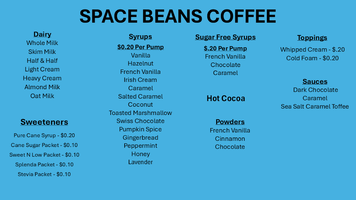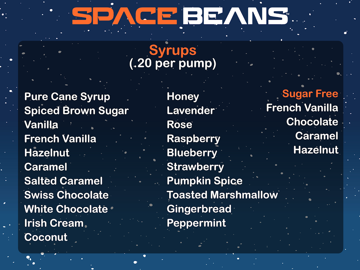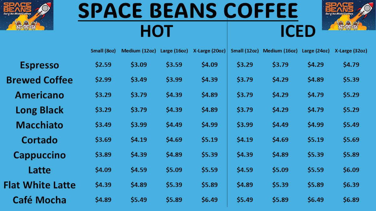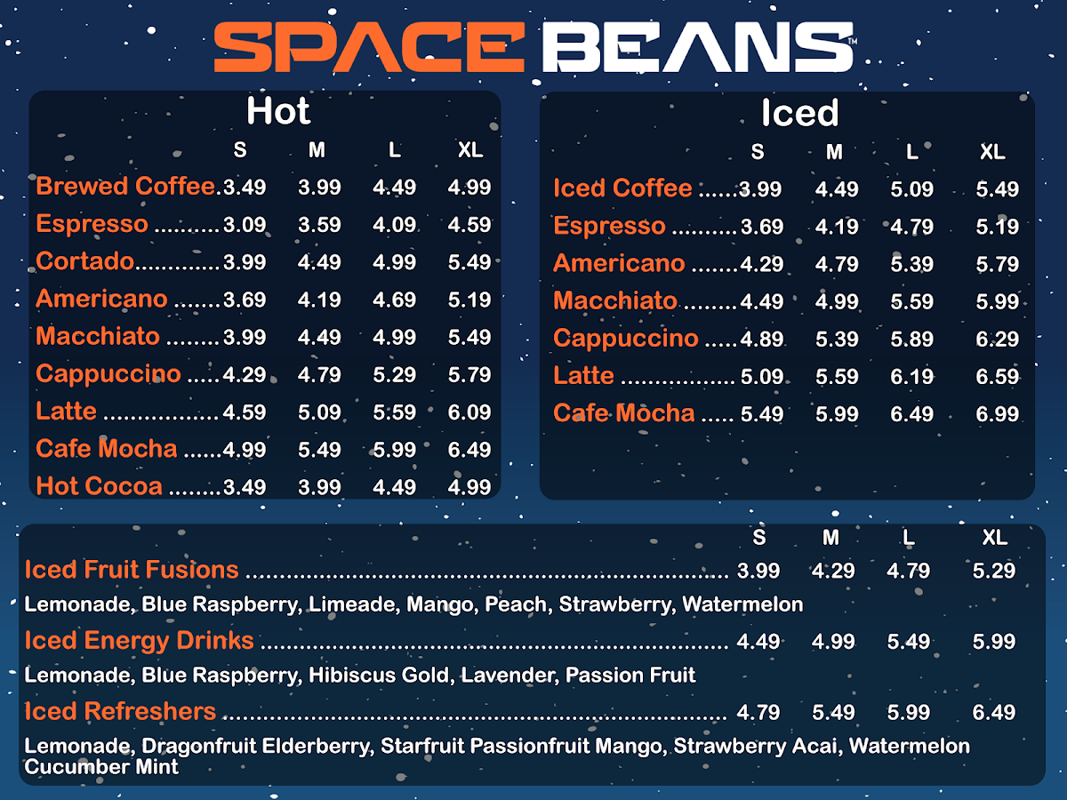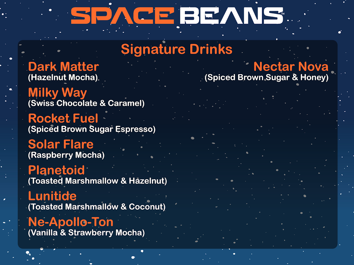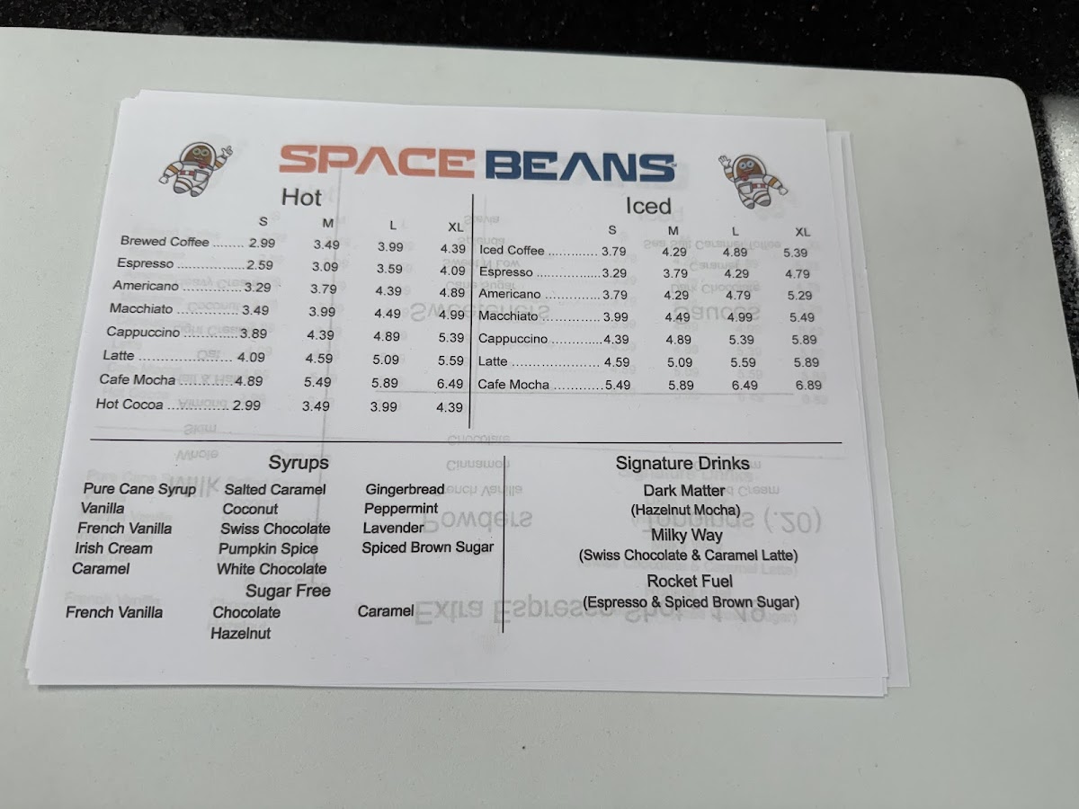 Indulge in a variety of brewed options, from classic espressos to flavorful lattes, each complemented by an extensive selection of syrups like salted caramel and lavender. Whether you're looking for a cozy place to work or a spot for a casual meet-up, Space Beans Coffee offers a friendly, inviting environment. Don't just take our word for it; patrons consistently praise the warm service and delicious blends. A visit here promises to be a memorable treat for coffee lovers!